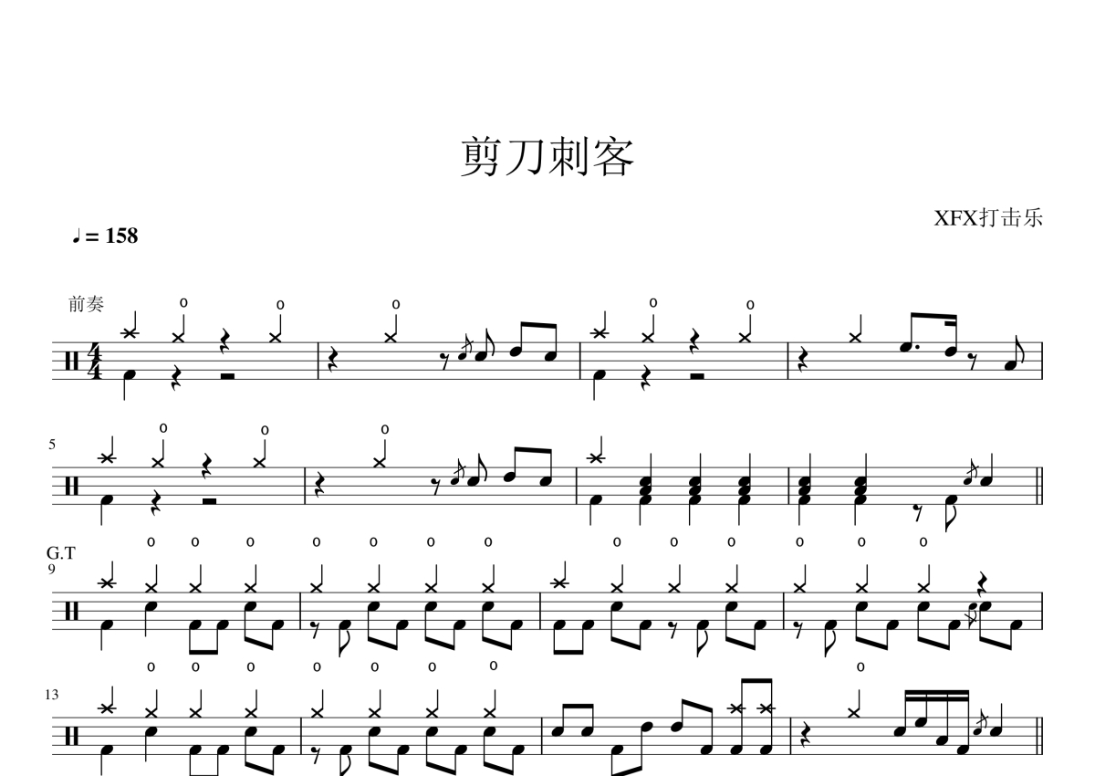 《剪刀刺客》是大主宰乐团演唱的一首歌曲,拍号为4/4拍,这份架子鼓谱共有四张高清图谱,图谱由 @陈老师 编配上传,图谱使用五线谱编配,使用这份剪刀刺客架子鼓谱,你将能够轻松地敲打出这首大主宰乐团的剪刀刺客,快来尝试吧。