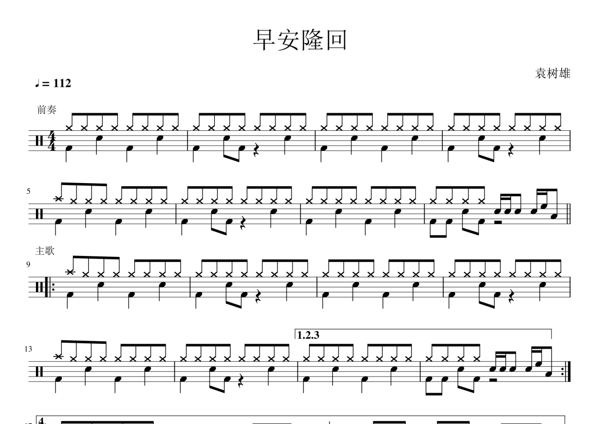 《早安隆回》是袁树维演唱的一首歌曲,拍号为4/4拍,这份架子鼓谱共有两张高清图谱,图谱由 @陈老师 编配上传,图谱使用五线谱编配,使用这份早安隆回架子鼓谱,你将能够轻松地敲打出这首袁树维的早安隆回,快来尝试吧。