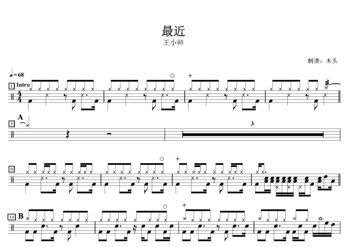 《最近》是王小帅演唱的一首歌曲,这份鼓谱共有两张高清图谱,图谱由 @打鼓谱 编配上传,图谱使用五线谱编配,使用这份最近架子鼓谱,你将能够轻松地敲打出这首王小帅的最近,快来尝试吧。歌曲名:最近,歌手名:王小帅,专辑名:最近(正式版)。