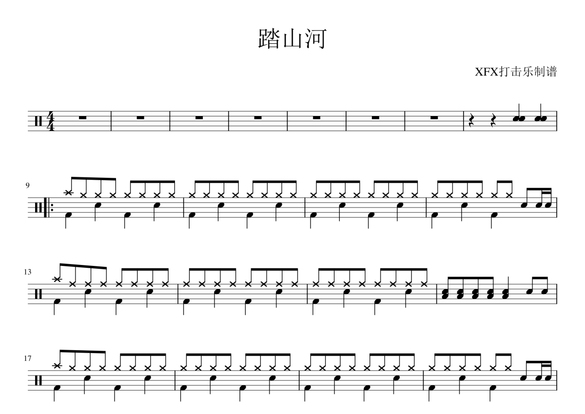 《踏山河》是七叔演唱的一首歌曲,拍号为4/4拍,这份架子鼓谱共有一张高清图谱,图谱由 @陈老师 编配上传,图谱使用五线谱编配,使用这份踏山河架子鼓谱,你将能够轻松地敲打出这首七叔的踏山河,快来尝试吧。