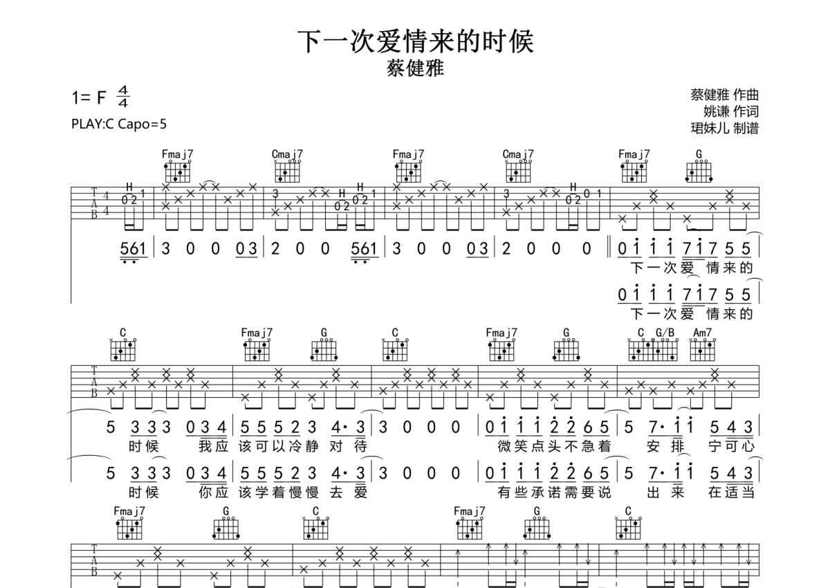 《下一次爱情来的时候》是蔡健雅演唱的一首歌曲,拍号为4/4拍,歌曲速度为每分钟85拍,歌曲原调为F调,但由于原调指法比较难,为了方便弹奏,本吉他谱采用的是C调指法编配,变调夹5品弹奏即为原调,当然也可以根据自己的音域改变变调夹位置,或者通过改变和弦调性,以方便自己弹奏,这份吉他谱共有两张高清图谱,图谱由 @珺妹儿 编配上传,图谱使用六线谱编配,包含吉他和弦指法、简谱以及歌词部分,使用这份下一次爱情来的时候吉他谱,可以让你更加方便地掌握这首歌曲的弹唱技巧,快来尝试吧。