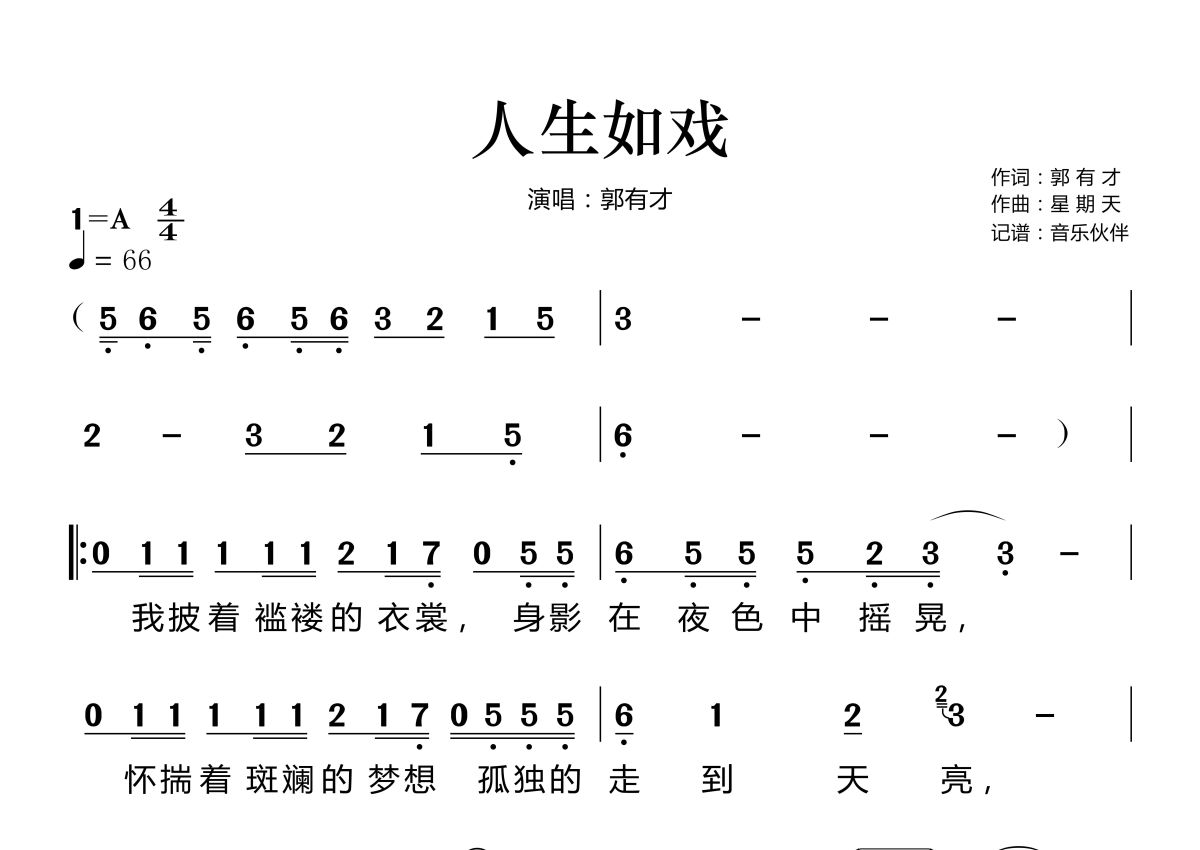 《人生如戏》是郭有才演唱的一首歌曲,这份简谱共有两张高清图谱,图谱由 @音乐伙伴 编配上传。