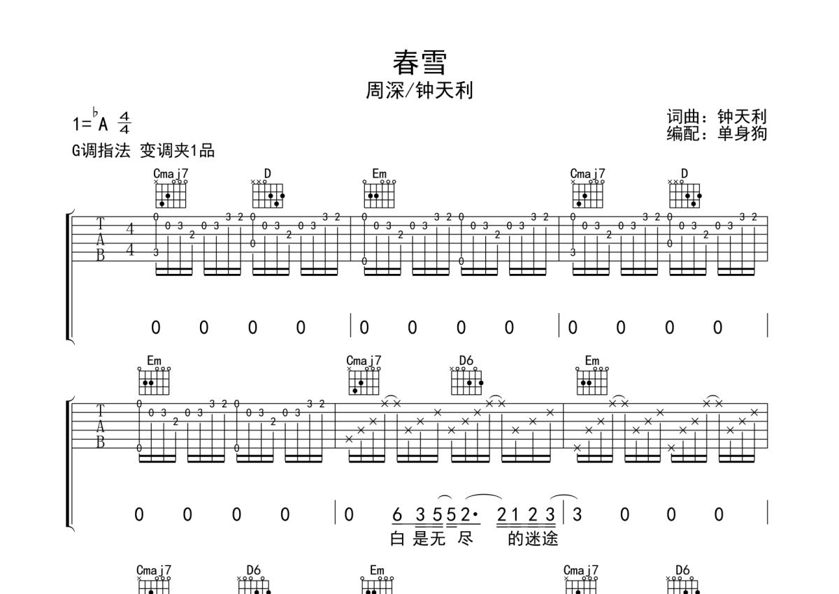 《春雪》是周深/钟天利演唱的一首歌曲,拍号为4/4拍,歌曲原调为Ab调,但由于原调指法比较难,为了方便弹奏,本吉他谱采用的是G调指法编配,变调夹1品弹奏即为原调,当然也可以根据自己的音域改变变调夹位置,或者通过改变和弦调性,以方便自己弹奏,这份吉他谱共有四张高清图谱,图谱由 @单身狗 编配上传,图谱使用六线谱编配,包含吉他和弦指法、简谱以及歌词部分,使用这份春雪吉他谱,可以让你更加方便地掌握这首歌曲的弹唱技巧,快来尝试吧。