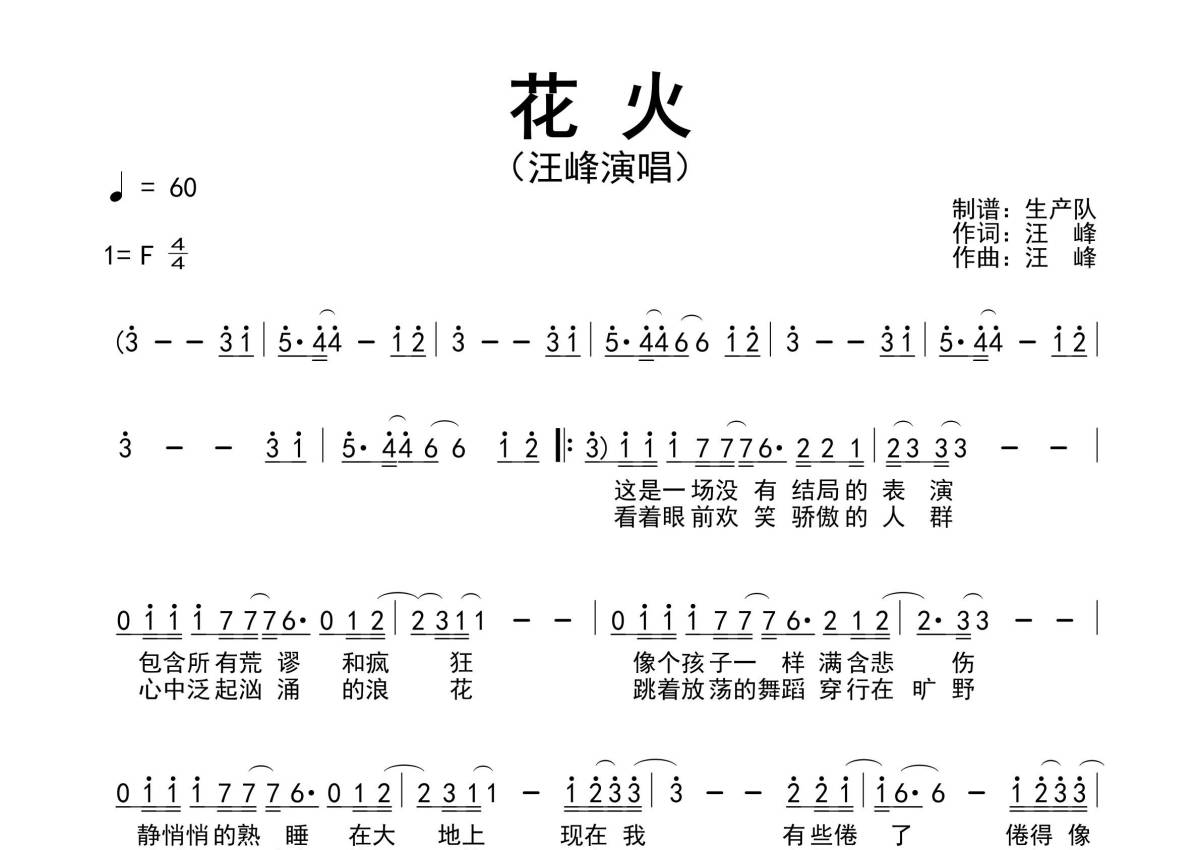 《花火》是汪峰演唱的一首歌曲,原版简谱,拍号为4/4拍,歌曲速度为每分钟60拍,这份简谱共有两张高清图谱,图谱由 @生产队 编配上传汪峰演唱的经典歌曲《花火》原版简谱。