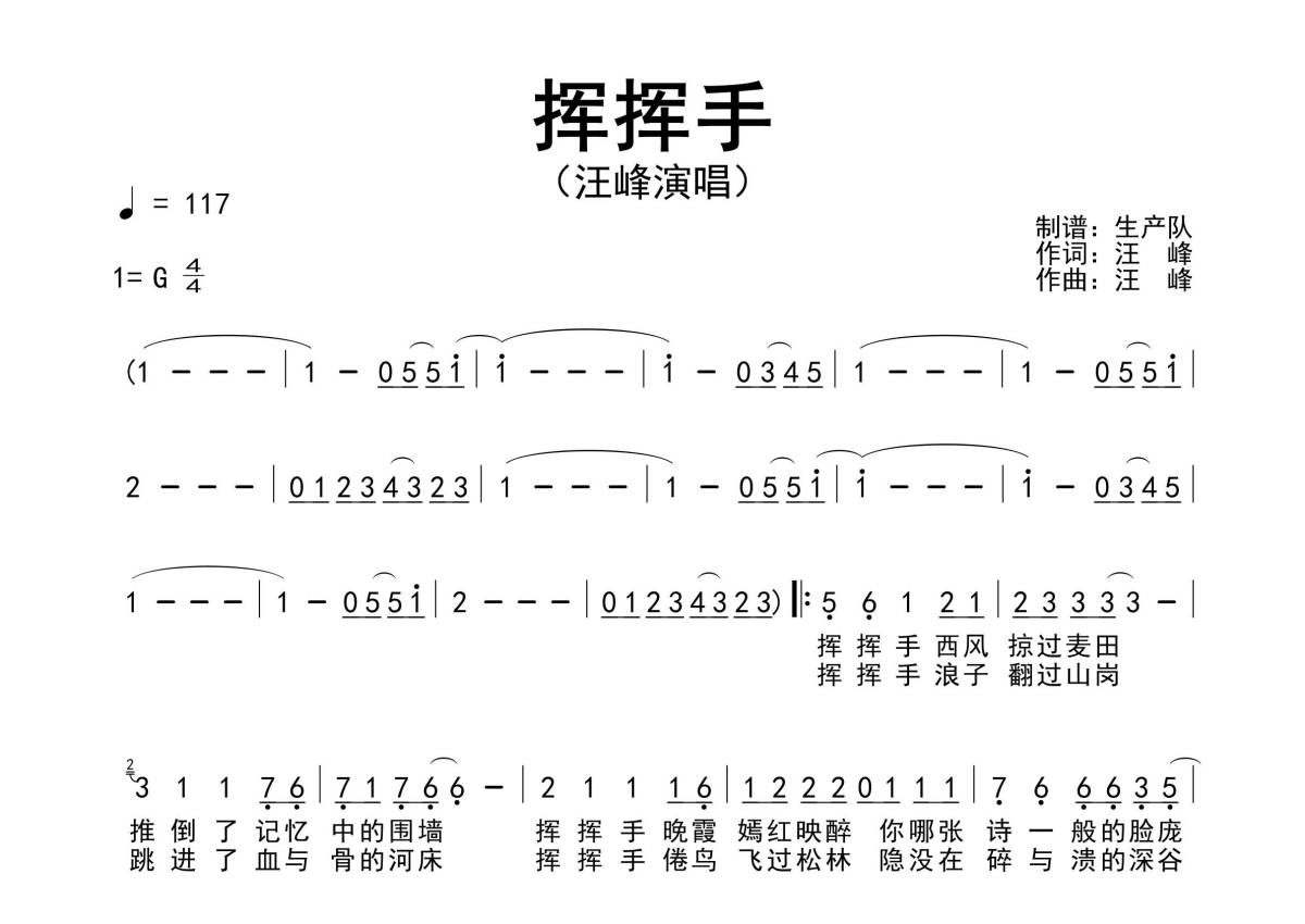 《挥挥手》是汪峰演唱的一首歌曲,原版简谱,拍号为4/4拍,歌曲速度为每分钟117拍,这份简谱共有两张高清图谱,图谱由 @生产队 编配上传汪峰演唱的经典歌曲《挥挥手》原版简谱。