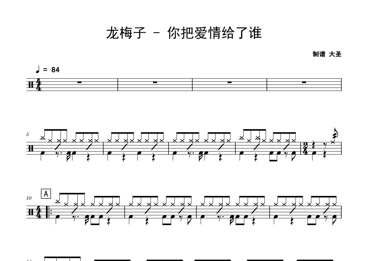 《你把爱情给了谁》是龙梅子演唱的一首歌曲,拍号为4/4拍,歌曲速度为每分钟84拍,这份架子鼓谱共有两张高清图谱,图谱由 @Sawubona 编配上传,图谱使用五线谱编配,使用这份你把爱情给了谁架子鼓谱,你将能够轻松地敲打出这首龙梅子的你把爱情给了谁,快来尝试吧。