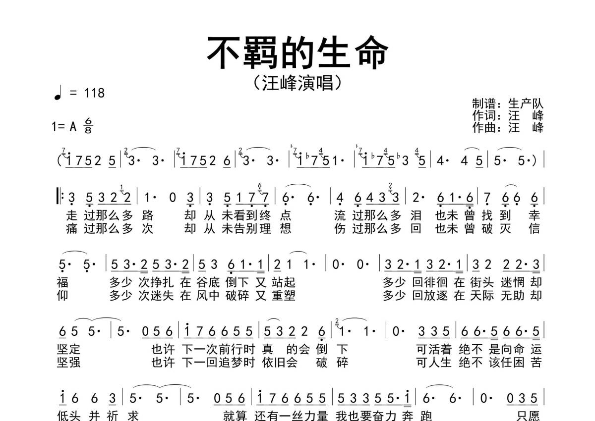 《不羁的生命》是汪峰演唱的一首歌曲,原版简谱,拍号为6/8拍,歌曲速度为每分钟118拍,这份简谱共有一张高清图谱,图谱由 @生产队 编配上传汪峰演唱的经典歌曲《不羁的生命》原版简谱。