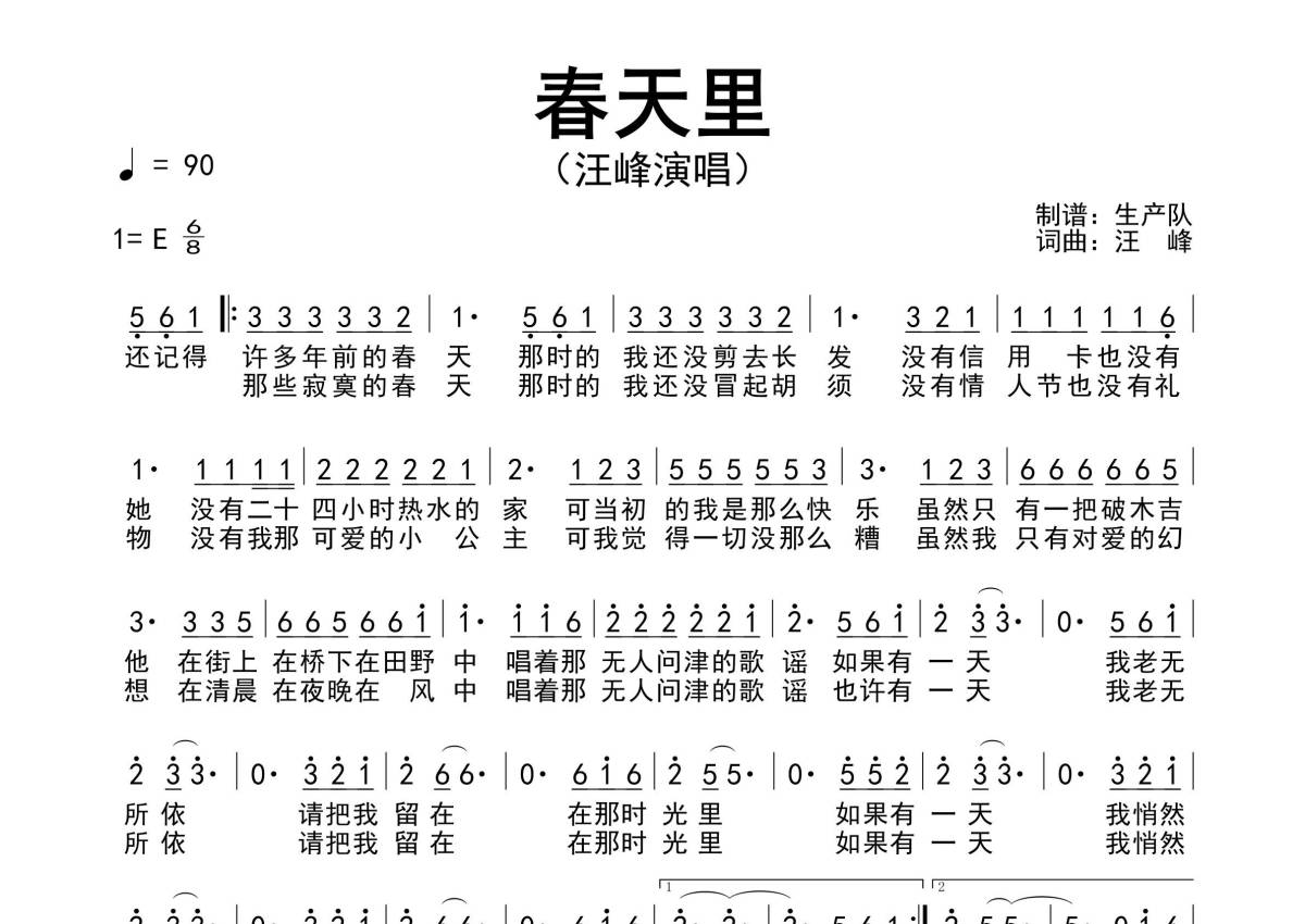 《春天里》是汪峰演唱的一首歌曲,原版简谱,拍号为6/8拍,歌曲速度为每分钟90拍,这份简谱共有一张高清图谱,图谱由 @生产队 编配上传汪峰演唱的经典歌曲《春天里》原版简谱。