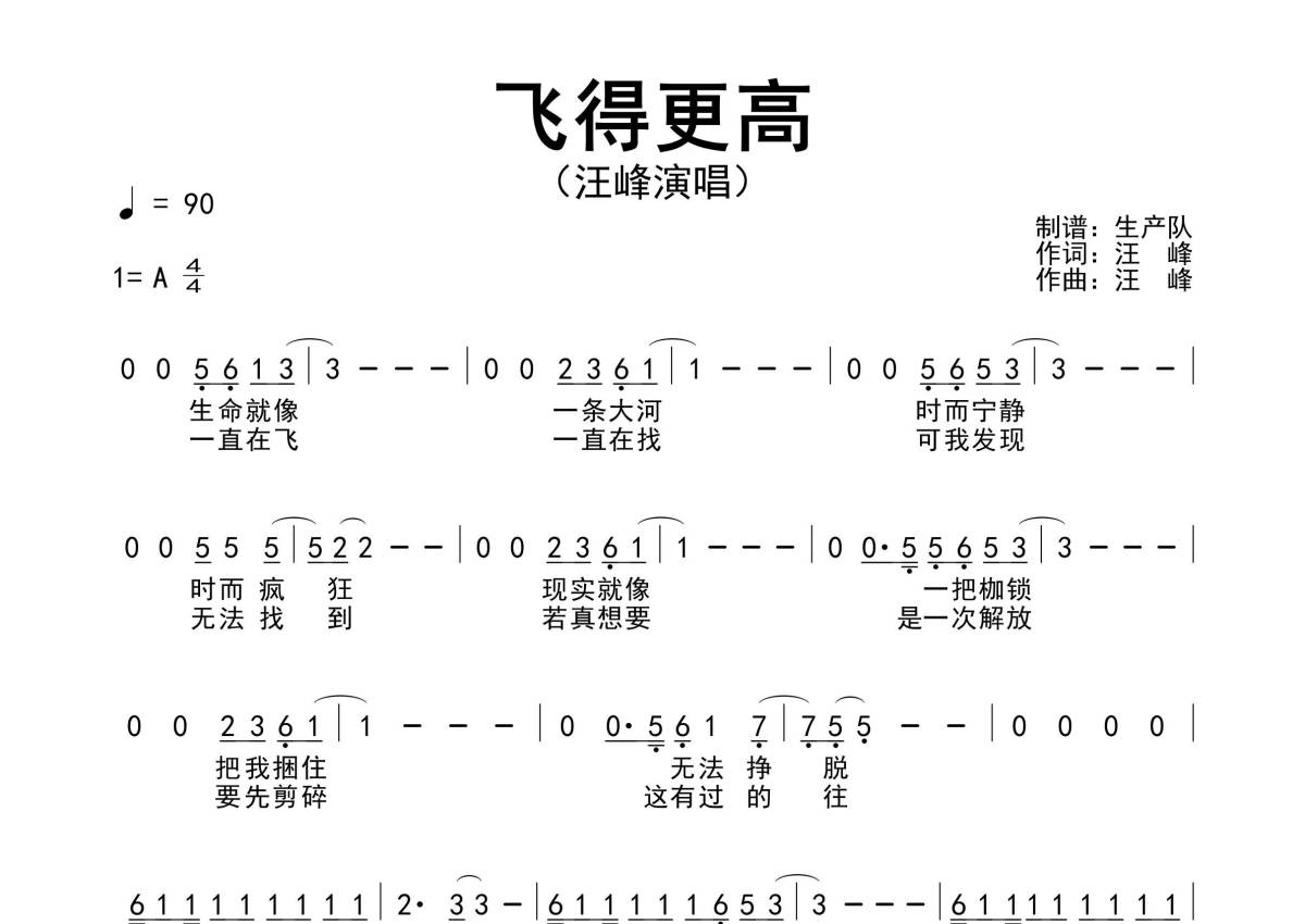 《飞得更高》是汪峰演唱的一首歌曲,原版简谱,拍号为4/4拍,歌曲速度为每分钟90拍,这份简谱共有一张高清图谱,图谱由 @生产队 编配上传汪峰演唱的经典歌曲《飞得更高》原版简谱。