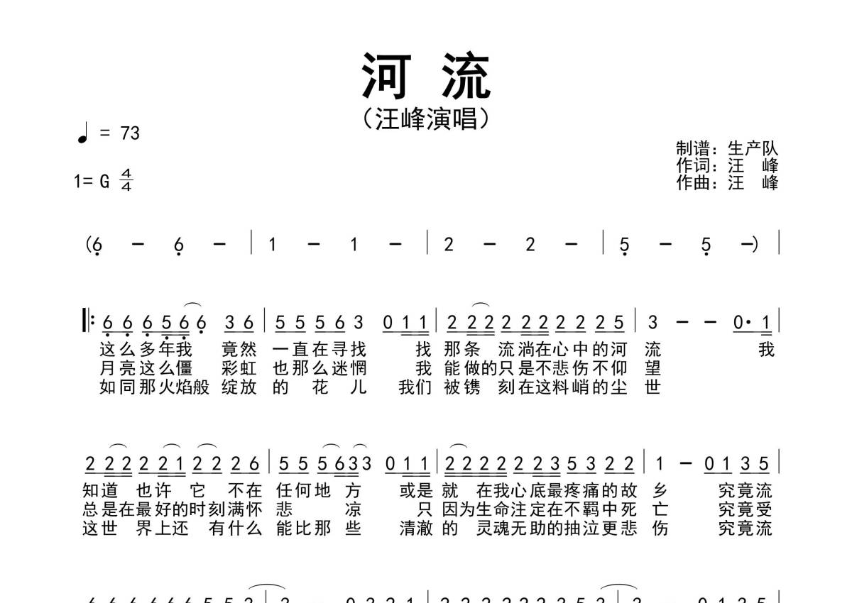 《河流》是汪峰演唱的一首歌曲,原版简谱,拍号为4/4拍,歌曲速度为每分钟73拍,这份简谱共有一张高清图谱,图谱由 @生产队 编配上传汪峰演唱的经典歌曲《河流》原版简谱。