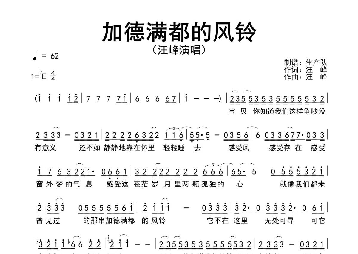 《加德满都的风铃》是汪峰演唱的一首歌曲,原版简谱,拍号为4/4拍,歌曲速度为每分钟62拍,这份简谱共有一张高清图谱,图谱由 @生产队 编配上传汪峰演唱的经典歌曲《加德满都的风铃》原版简谱。