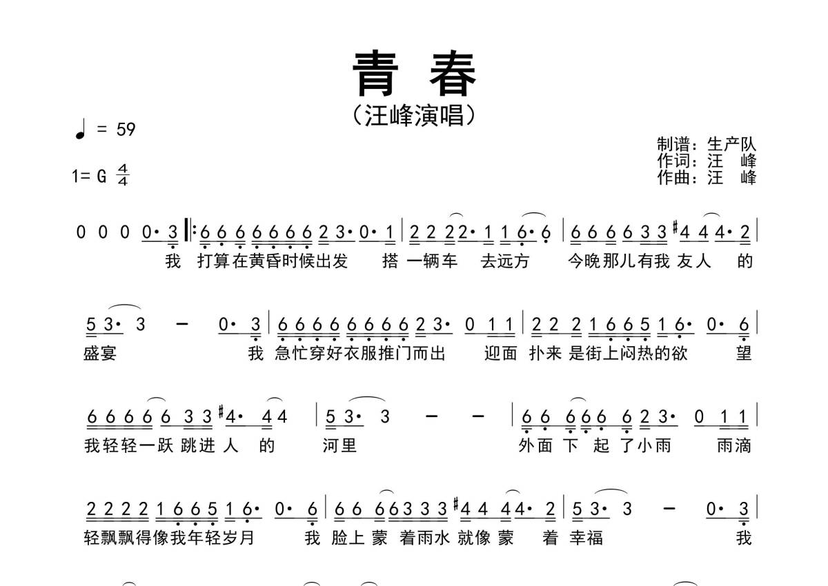 《青春》是汪峰演唱的一首歌曲,原版简谱,拍号为4/4拍,歌曲速度为每分钟59拍,这份简谱共有一张高清图谱,图谱由 @生产队 编配上传汪峰演唱的经典歌曲《青春》原版简谱。