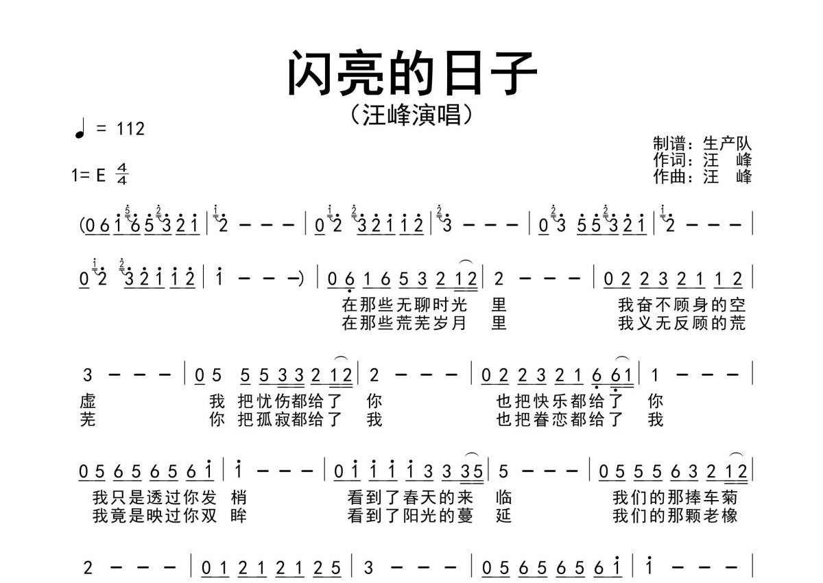 《闪亮的日子》是汪峰演唱的一首歌曲,原版简谱,拍号为4/4拍,歌曲速度为每分钟112拍,这份简谱共有一张高清图谱,图谱由 @生产队 编配上传汪峰演唱的经典歌曲《闪亮的日子》原版简谱。