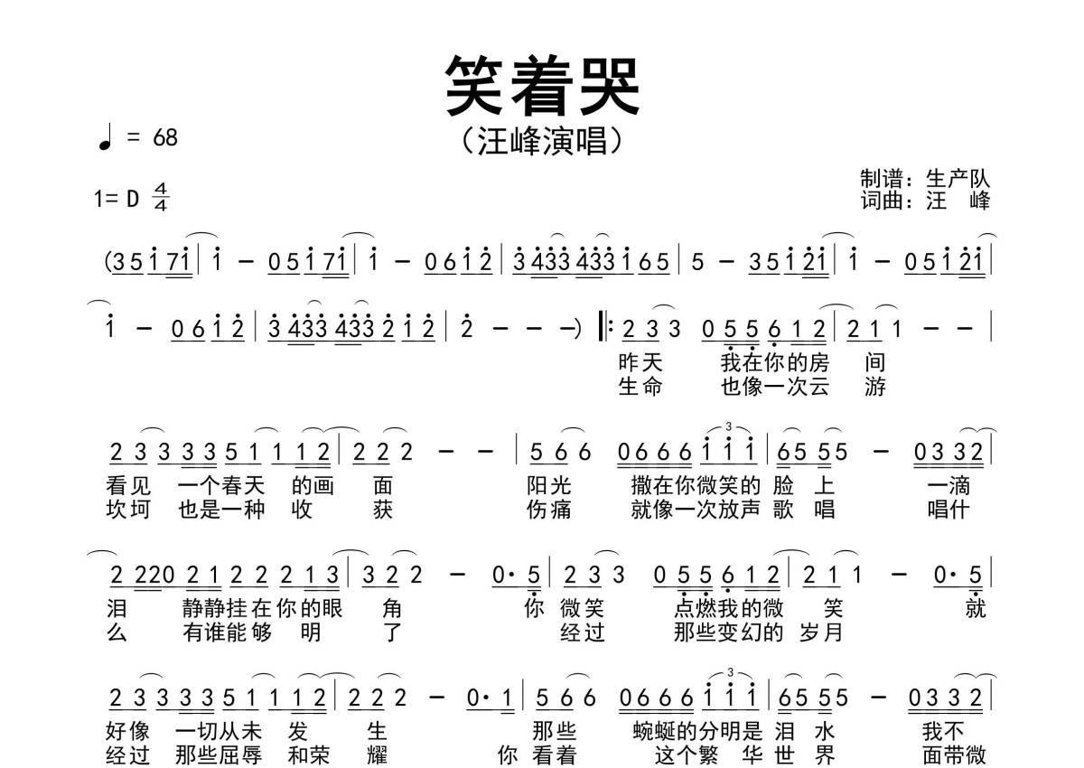 《笑着哭》是汪峰演唱的一首歌曲,原版简谱,拍号为4/4拍,歌曲速度为每分钟68拍,这份简谱共有一张高清图谱,图谱由 @生产队 编配上传汪峰演唱的经典歌曲《笑着哭》原版简谱。