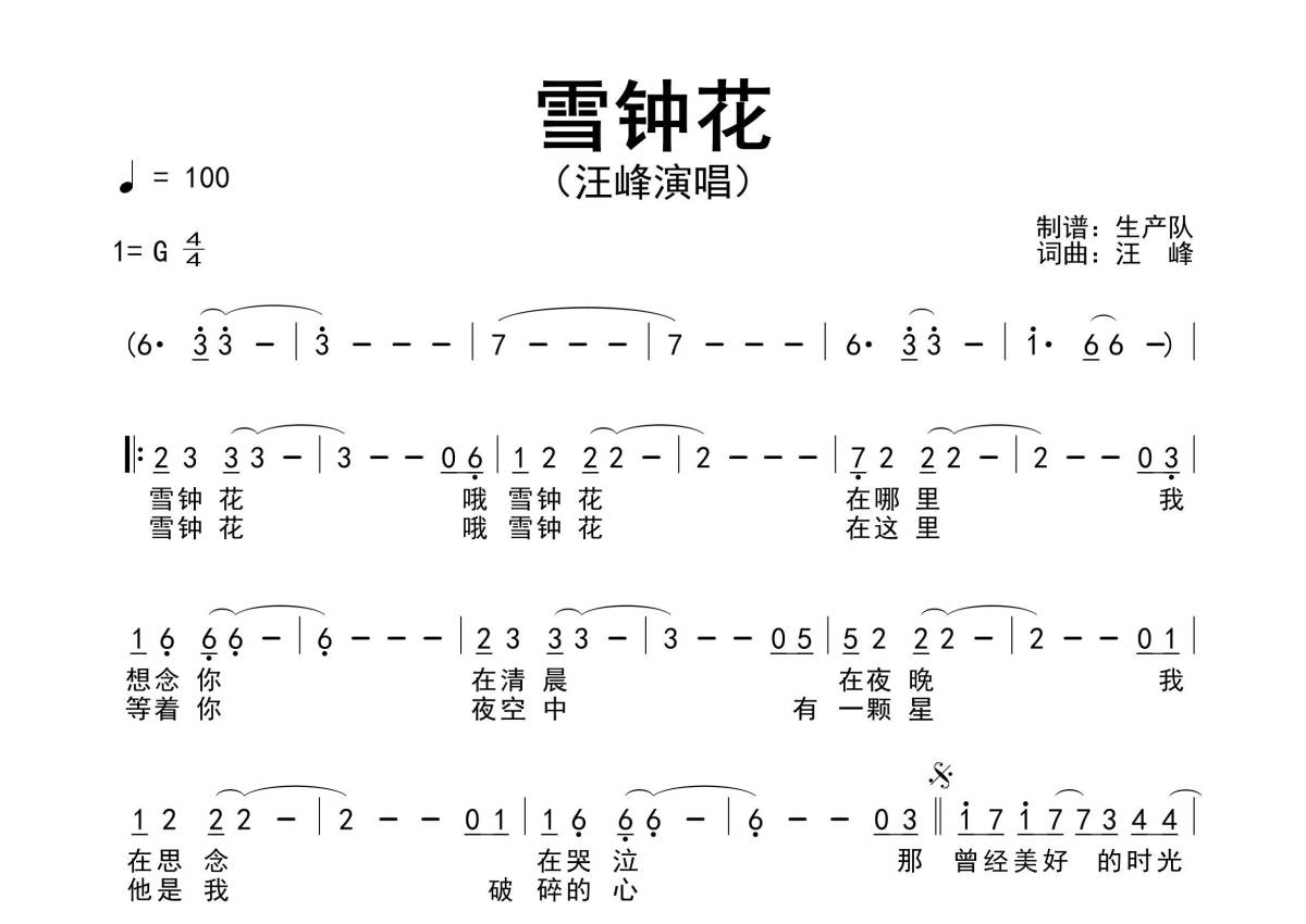《雪钟花》是汪峰演唱的一首歌曲,原版简谱,拍号为4/4拍,歌曲速度为每分钟100拍,这份简谱共有一张高清图谱,图谱由 @生产队 编配上传汪峰演唱的经典歌曲《雪钟花》原版简谱。