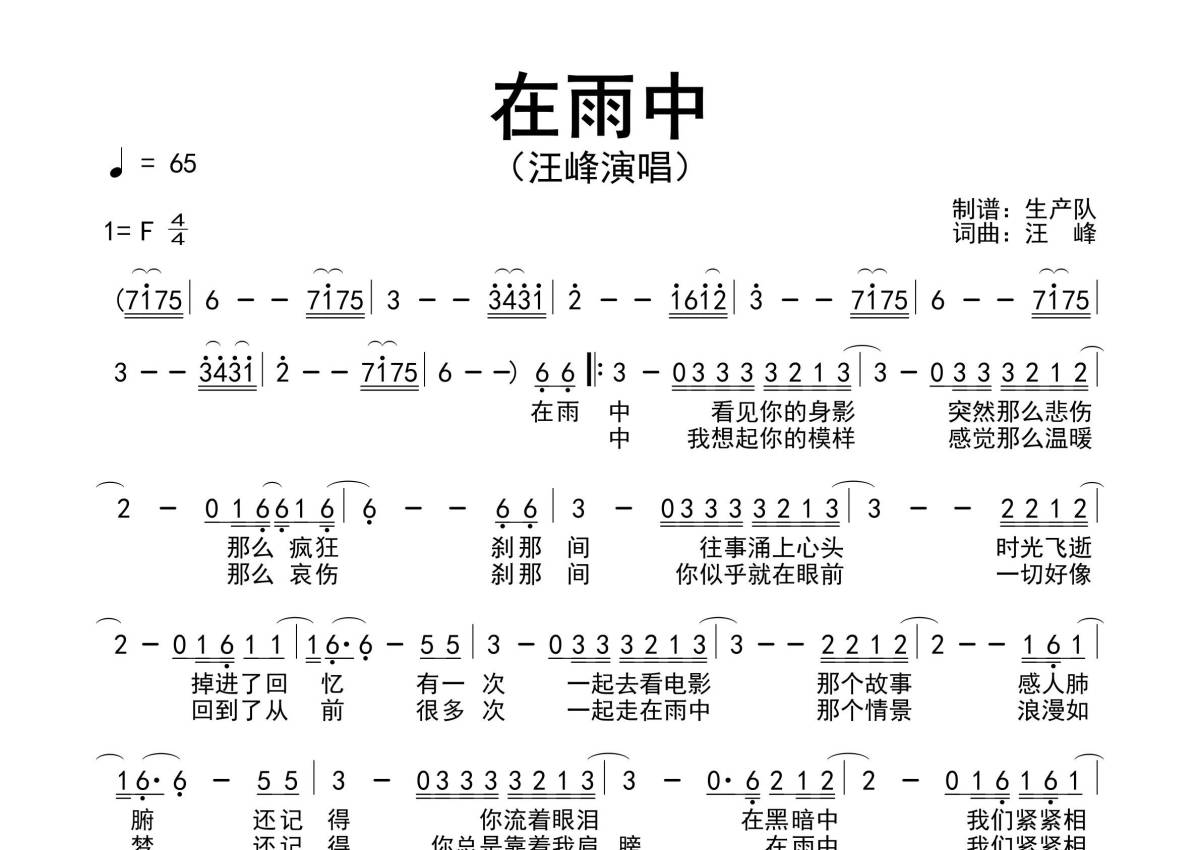 《在雨中》是汪峰演唱的一首歌曲,原版简谱,拍号为4/4拍,歌曲速度为每分钟65拍,这份简谱共有一张高清图谱,图谱由 @生产队 编配上传汪峰演唱的经典歌曲《在雨中》原版简谱。