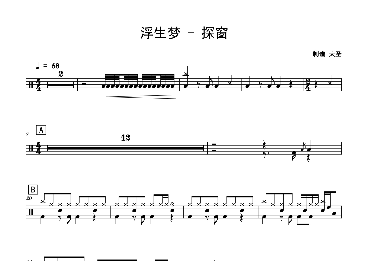 《探窗》是浮生梦演唱的一首歌曲,拍号为4/4拍,歌曲速度为每分钟68拍,这份架子鼓谱共有两张高清图谱,图谱由 @Sawubona 编配上传,图谱使用五线谱编配,使用这份探窗架子鼓谱,你将能够轻松地敲打出这首浮生梦的探窗,快来尝试吧。