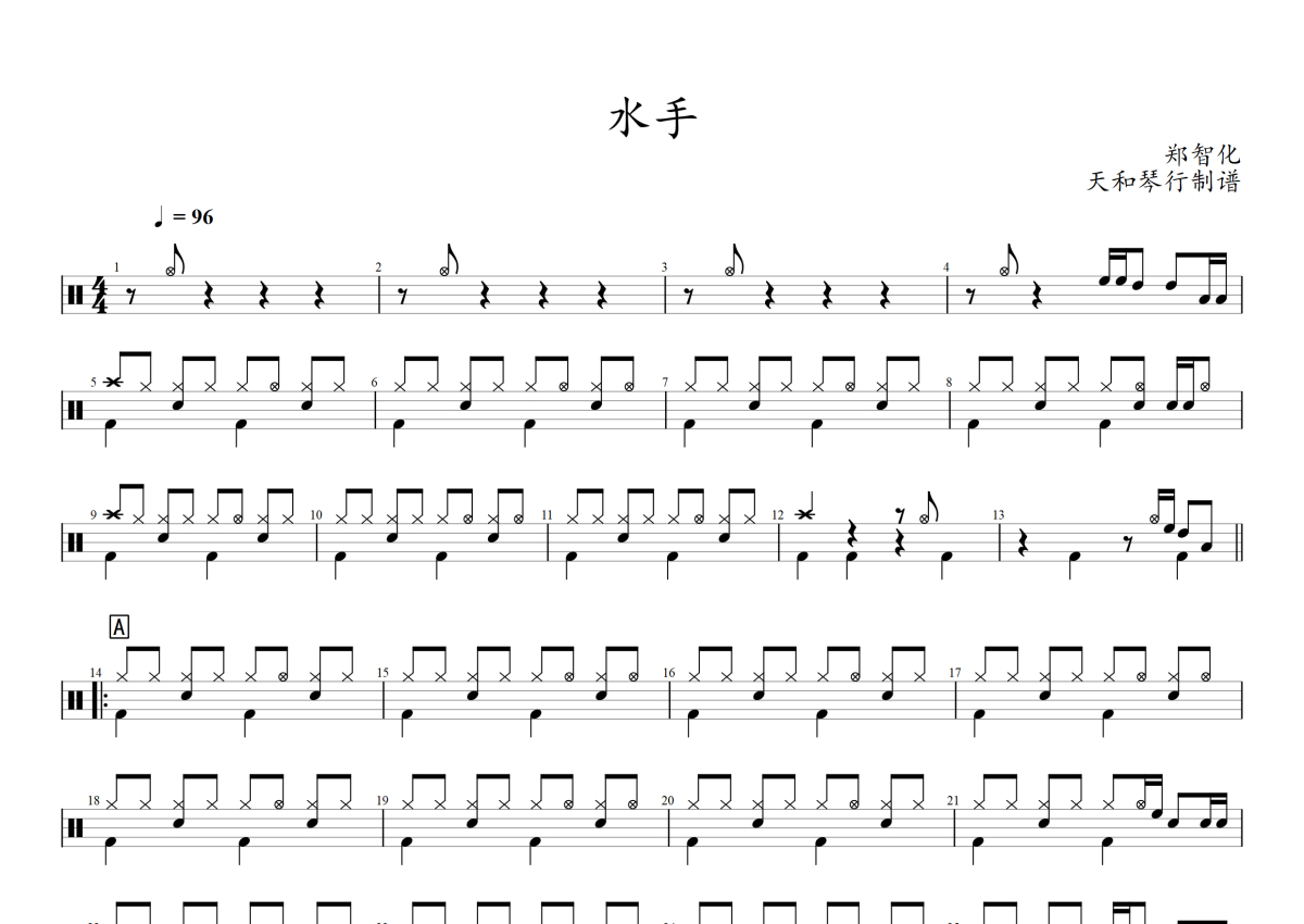 《水手》是郑智化演唱的一首歌曲,拍号为4/4拍,歌曲速度为每分钟96拍,这份架子鼓谱共有两张高清图谱,图谱由 @音符喷血者 编配上传,图谱使用五线谱编配,使用这份水手架子鼓谱,你将能够轻松地敲打出这首郑智化的水手,快来尝试吧。