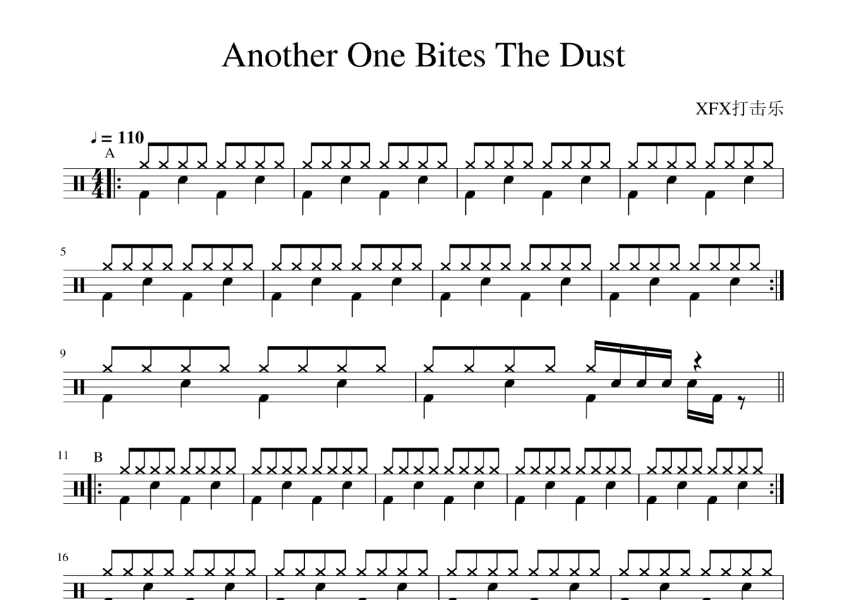 《Another One Bites The Dust》是Queen(皇后乐队)演唱的一首歌曲,拍号为4/4拍,歌曲速度为每分钟110拍,这份架子鼓谱共有两张高清图谱,图谱由 @陈老师 编配上传,图谱使用五线谱编配,使用这份Another One Bites The Dust架子鼓谱,你将能够轻松地敲打出这首Queen(皇后乐队)的Another One Bites The Dust,快来尝试吧。
