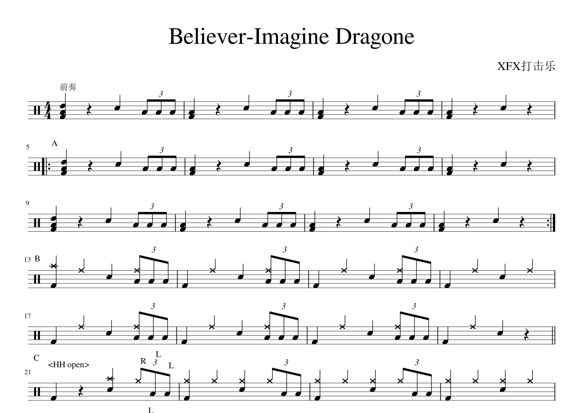 《Believer》是Imagine Dragons演唱的一首歌曲,拍号为4/4拍,这份架子鼓谱共有两张高清图谱,图谱由 @陈老师 编配上传,图谱使用五线谱编配,使用这份Believer架子鼓谱,你将能够轻松地敲打出这首Imagine Dragons的Believer,快来尝试吧。