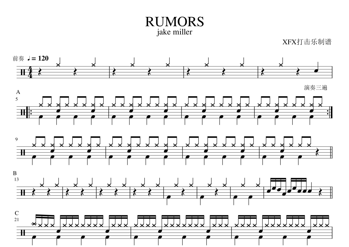《RUMORS》是Jake Miller演唱的一首歌曲,拍号为4/4拍,歌曲速度为每分钟120拍,这份架子鼓谱共有两张高清图谱,图谱由 @陈老师 编配上传,图谱使用五线谱编配,使用这份RUMORS架子鼓谱,你将能够轻松地敲打出这首Jake Miller的RUMORS,快来尝试吧。