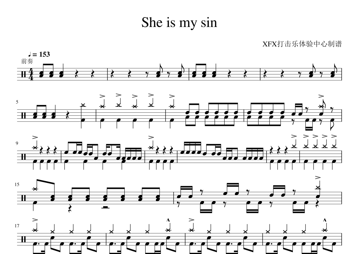 《She is my sin》是Nightwish夜愿演唱的一首歌曲,拍号为4/4拍,歌曲速度为每分钟153拍,这份架子鼓谱共有三张高清图谱,图谱由 @陈老师 编配上传,图谱使用五线谱编配,使用这份She is my sin架子鼓谱,你将能够轻松地敲打出这首Nightwish夜愿的She is my sin,快来尝试吧。
