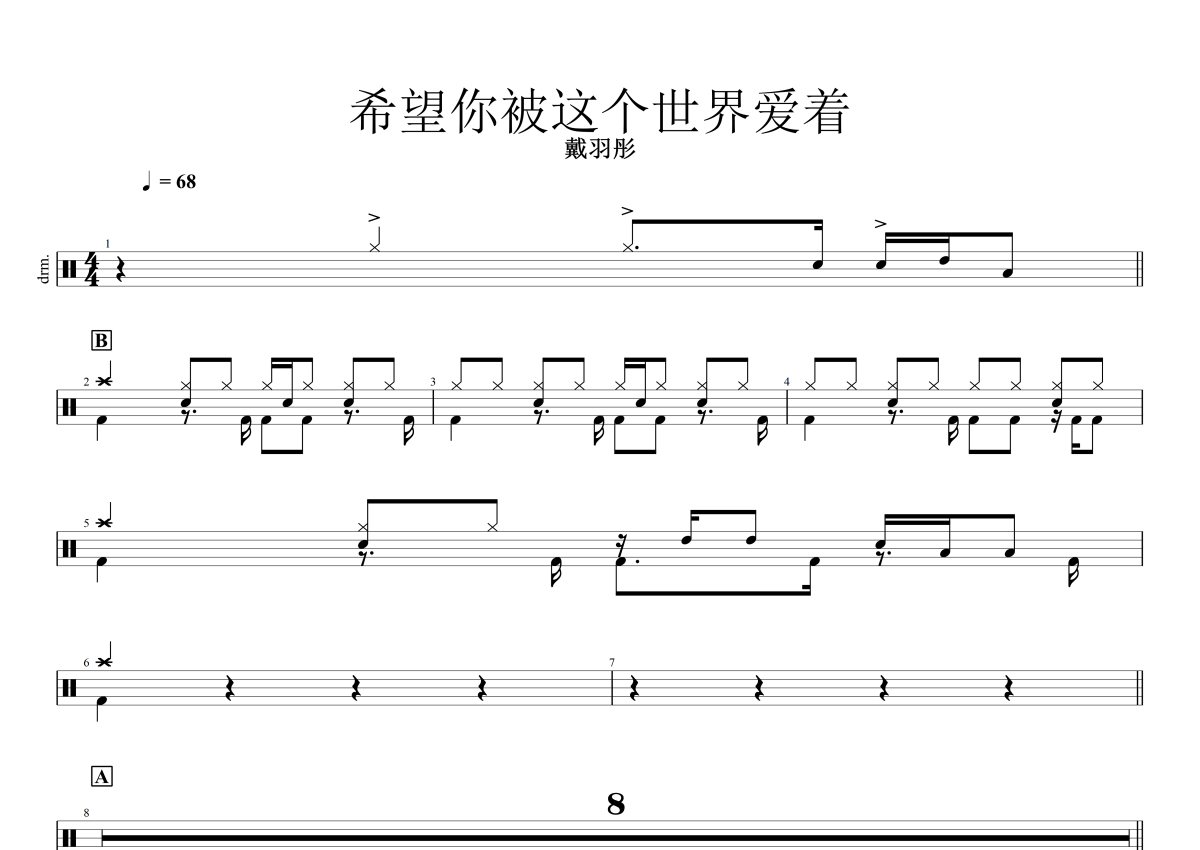 《希望你被这个世界爱着》是戴羽彤演唱的一首歌曲,拍号为4/4拍,歌曲速度为每分钟68拍,这份架子鼓谱共有两张高清图谱,图谱由 @小东鼓谱 编配上传,图谱使用五线谱编配,使用这份希望你被这个世界爱着架子鼓谱,你将能够轻松地敲打出这首戴羽彤的希望你被这个世界爱着,快来尝试吧。