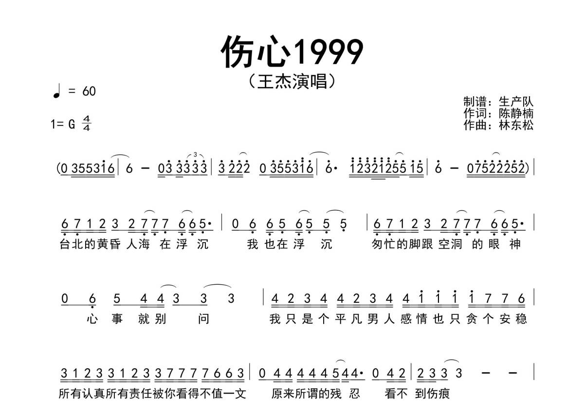 《伤心1999》是王杰演唱的一首歌曲,原版简谱,拍号为4/4拍,歌曲速度为每分钟60拍,这份简谱共有两张高清图谱,图谱由 @生产队 编配上传王杰演唱的经典歌曲《伤心1999》原版简谱。
