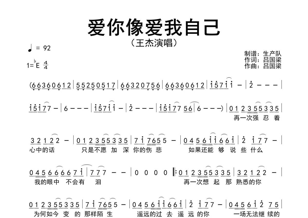 《爱你像爱我自己》是王杰演唱的一首歌曲,原版简谱,拍号为4/4拍,歌曲速度为每分钟92拍,这份简谱共有一张高清图谱,图谱由 @生产队 编配上传王杰演唱的经典歌曲《爱你像爱我自己》原版简谱。