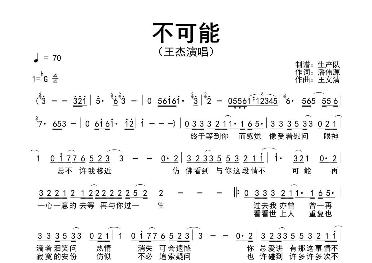 《不可能》是王杰演唱的一首歌曲,原版简谱,拍号为4/4拍,歌曲速度为每分钟70拍,这份简谱共有一张高清图谱,图谱由 @生产队 编配上传王杰演唱的经典歌曲《不可能》原版简谱。