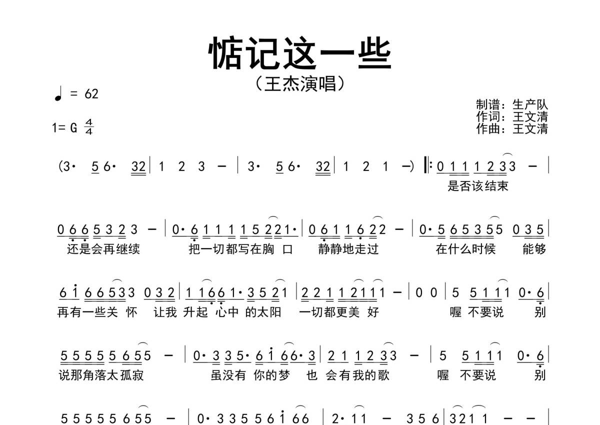 《惦记这一些》是王杰演唱的一首歌曲,原版简谱,拍号为4/4拍,歌曲速度为每分钟62拍,这份简谱共有一张高清图谱,图谱由 @生产队 编配上传王杰演唱的经典歌曲《惦记这一些》原版简谱。