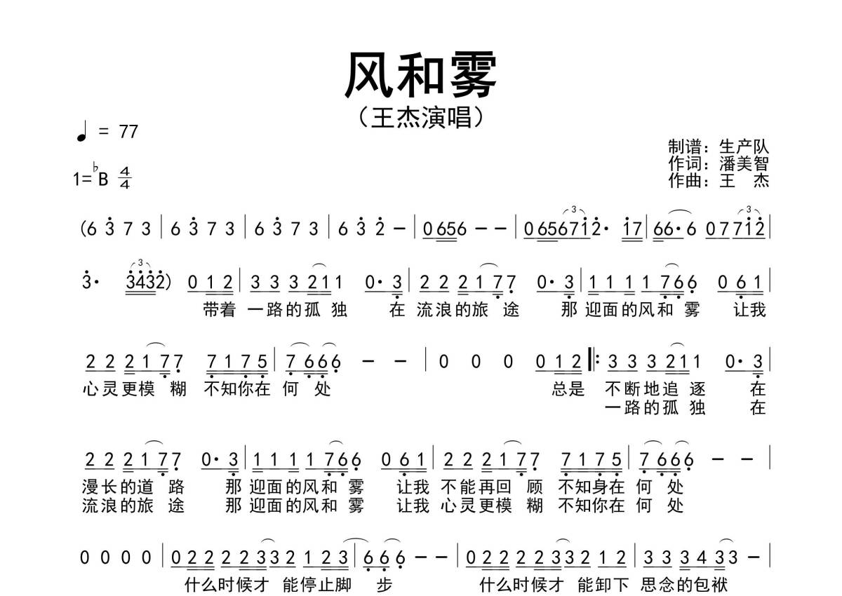 《风和雾》是王杰演唱的一首歌曲,原版简谱,拍号为4/4拍,歌曲速度为每分钟77拍,这份简谱共有一张高清图谱,图谱由 @生产队 编配上传王杰演唱的经典歌曲《风和雾》原版简谱。