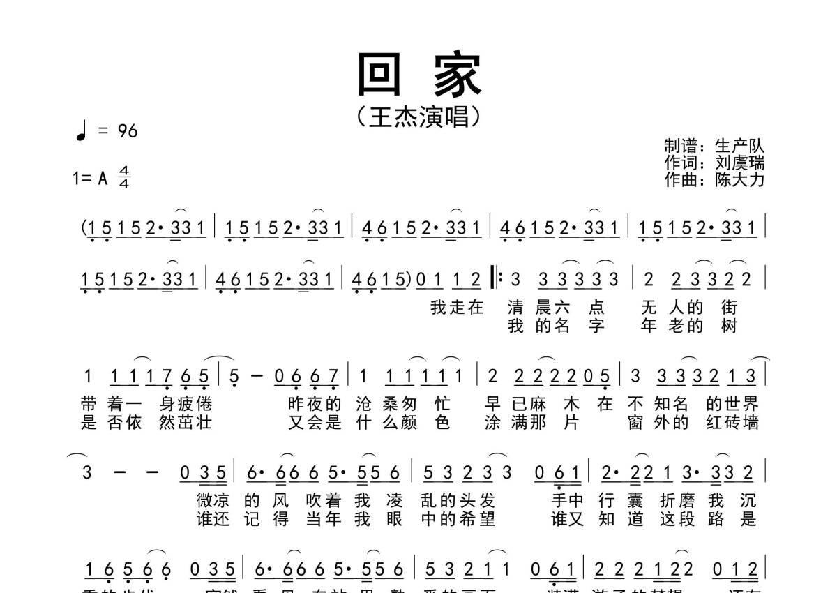 《回家》是王杰演唱的一首歌曲,原版简谱,拍号为4/4拍,歌曲速度为每分钟96拍,这份简谱共有一张高清图谱,图谱由 @生产队 编配上传王杰演唱的经典歌曲《回家》原版简谱。