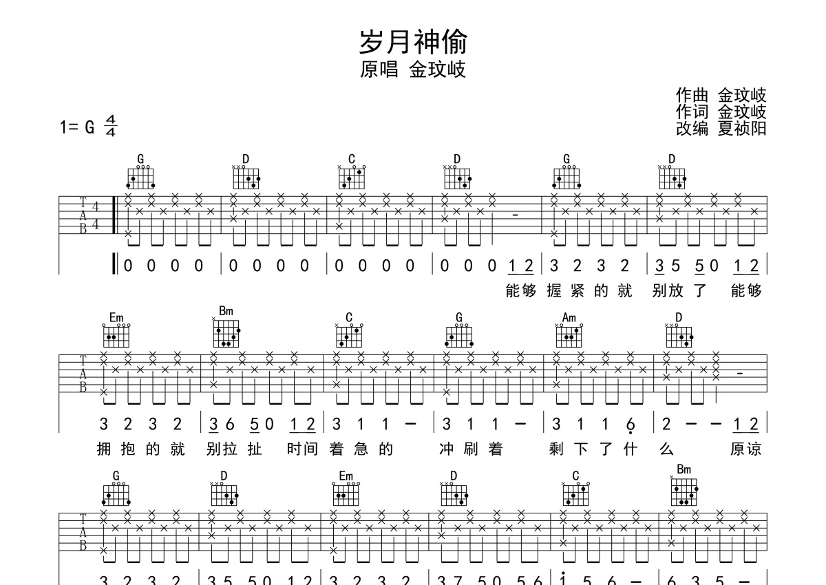 金玟岐《岁月神偷》吉他谱 - G调弹唱六线谱