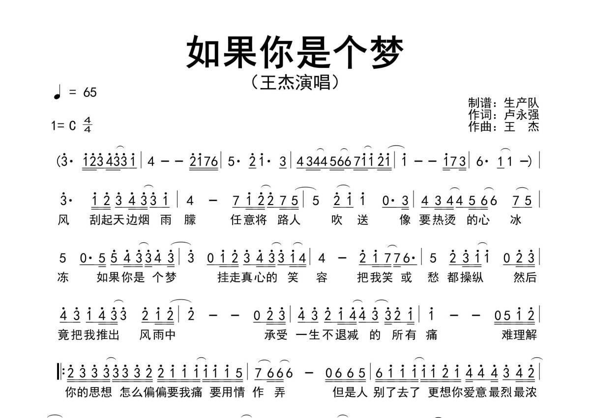 《如果你是个梦》是王杰演唱的一首歌曲,原版简谱,拍号为4/4拍,歌曲速度为每分钟65拍,这份简谱共有一张高清图谱,图谱由 @生产队 编配上传王杰演唱的经典歌曲《如果你是个梦》原版简谱。