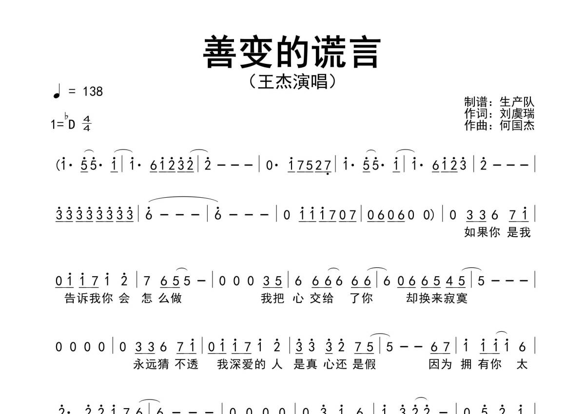 《善变的谎言》是王杰演唱的一首歌曲,原版简谱,拍号为4/4拍,歌曲速度为每分钟138拍,这份简谱共有一张高清图谱,图谱由 @生产队 编配上传王杰演唱的经典歌曲《善变的谎言》原版简谱。