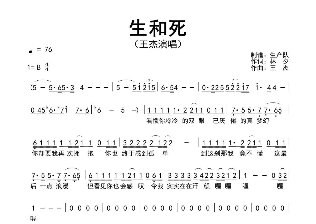 《生和死》是王杰演唱的一首歌曲,原版简谱,拍号为4/4拍,歌曲速度为每分钟75拍,这份简谱共有一张高清图谱,图谱由 @生产队 编配上传王杰演唱的经典歌曲《生和死》原版简谱。