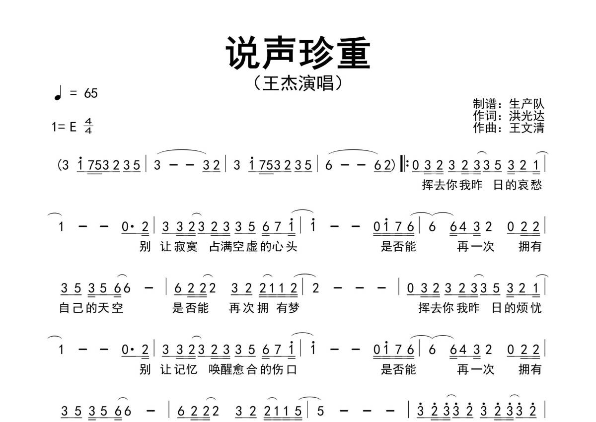 《说声珍重》是王杰演唱的一首歌曲,原版简谱,拍号为4/4拍,歌曲速度为每分钟65拍,这份简谱共有一张高清图谱,图谱由 @生产队 编配上传王杰演唱的经典歌曲《说声珍重》原版简谱。