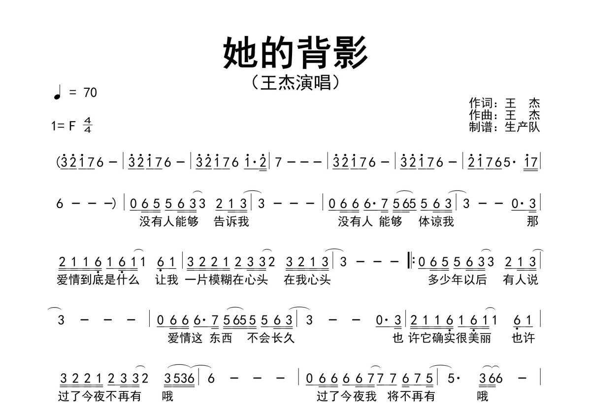 《她的背影》是王杰演唱的一首歌曲,原版简谱,拍号为4/4拍,歌曲速度为每分钟70拍,这份简谱共有一张高清图谱,图谱由 @生产队 编配上传王杰演唱的经典歌曲《她的背影》原版简谱。