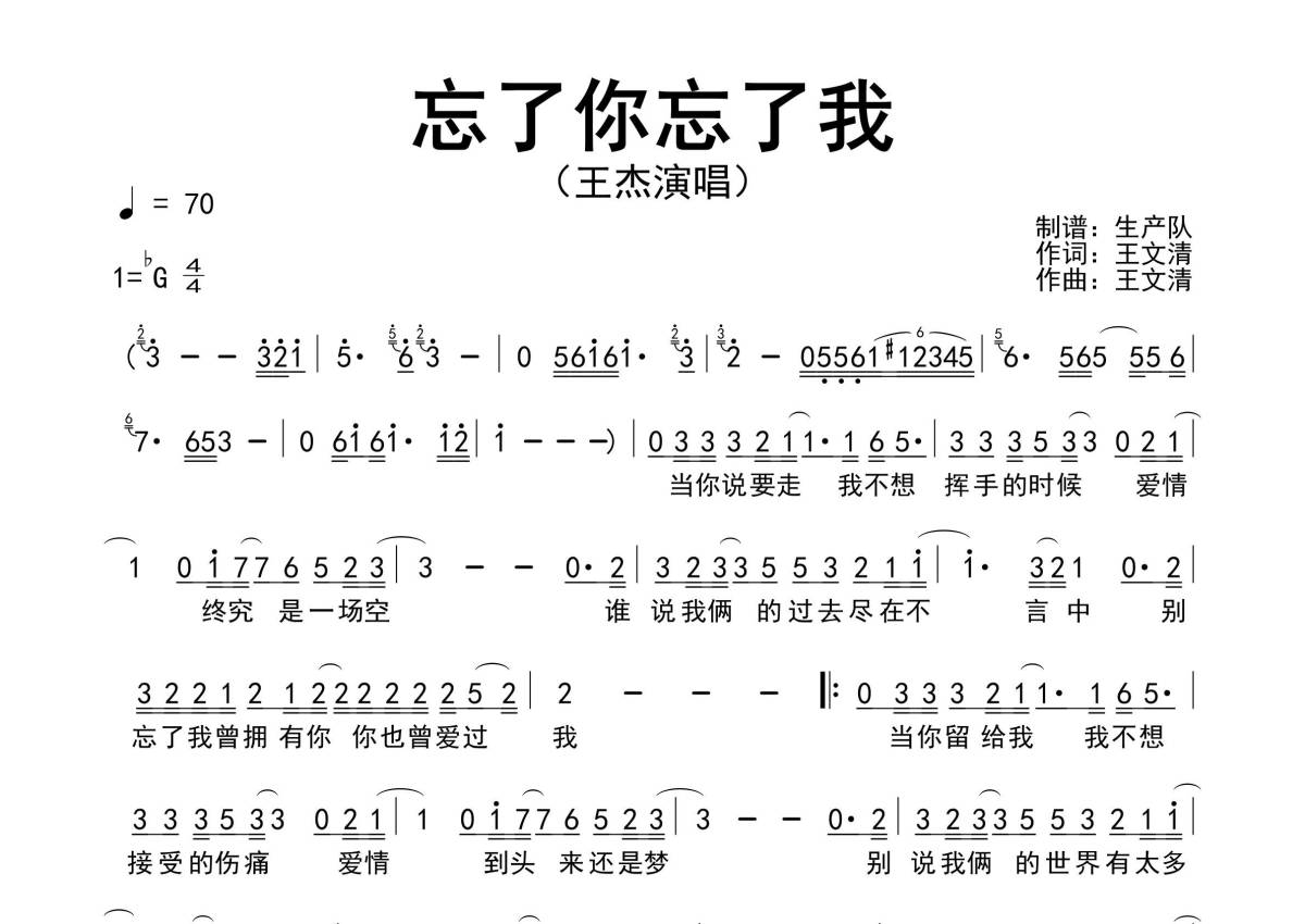 《忘了你忘了我》是王杰演唱的一首歌曲,原版简谱,拍号为4/4拍,歌曲速度为每分钟70拍,这份简谱共有一张高清图谱,图谱由 @生产队 编配上传王杰演唱的经典歌曲《忘了你忘了我》原版简谱。