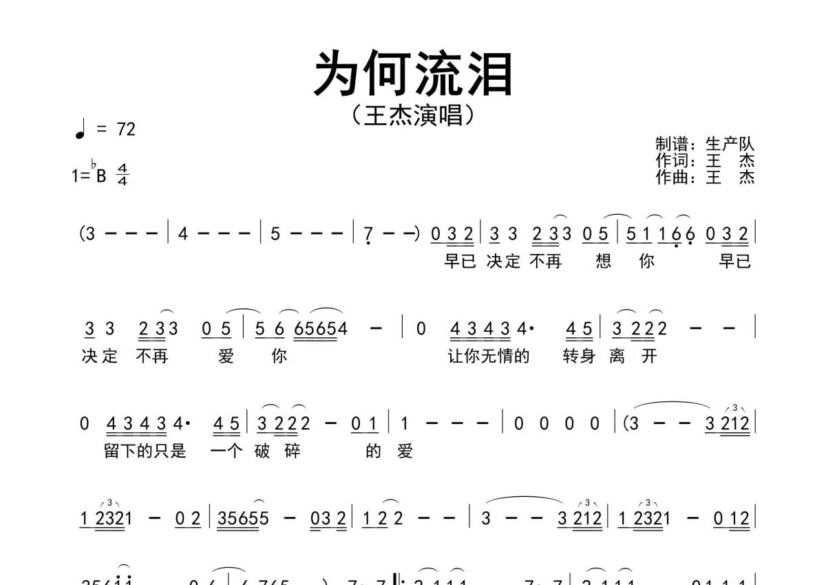 《为何流泪》是王杰演唱的一首歌曲,原版简谱,拍号为4/4拍,歌曲速度为每分钟72拍,这份简谱共有一张高清图谱,图谱由 @生产队 编配上传王杰演唱的经典歌曲《为何流泪》原版简谱。