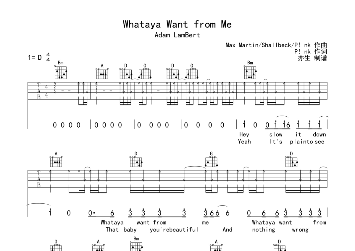 Whataya Want from Me吉他谱 - Adam Lambert - D调弹唱六线谱