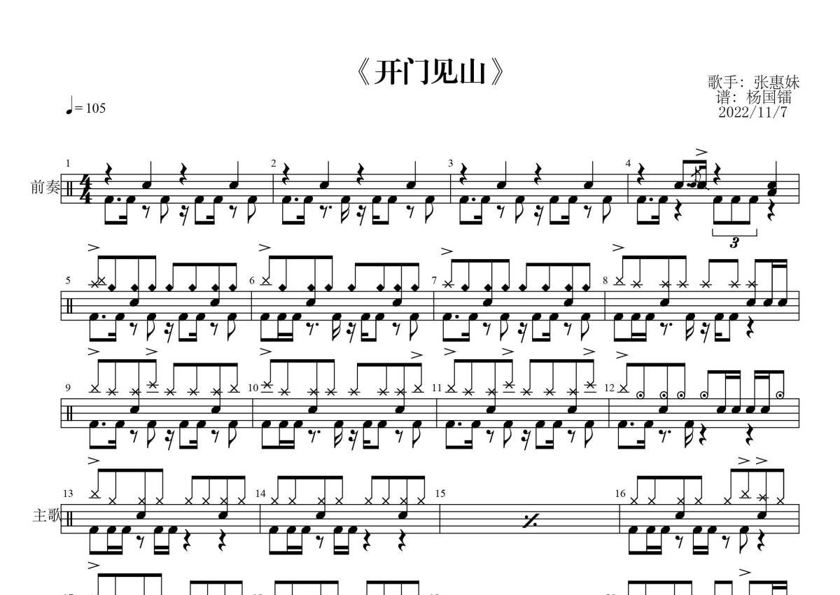 《开门见山》是张惠妹演唱的一首歌曲,拍号为4/4拍,歌曲速度为每分钟105拍,这份架子鼓谱共有三张高清图谱,图谱由 @抓猫儿「镭」 编配上传,图谱使用五线谱编配,使用这份开门见山架子鼓谱,你将能够轻松地敲打出这首张惠妹的开门见山,快来尝试吧。