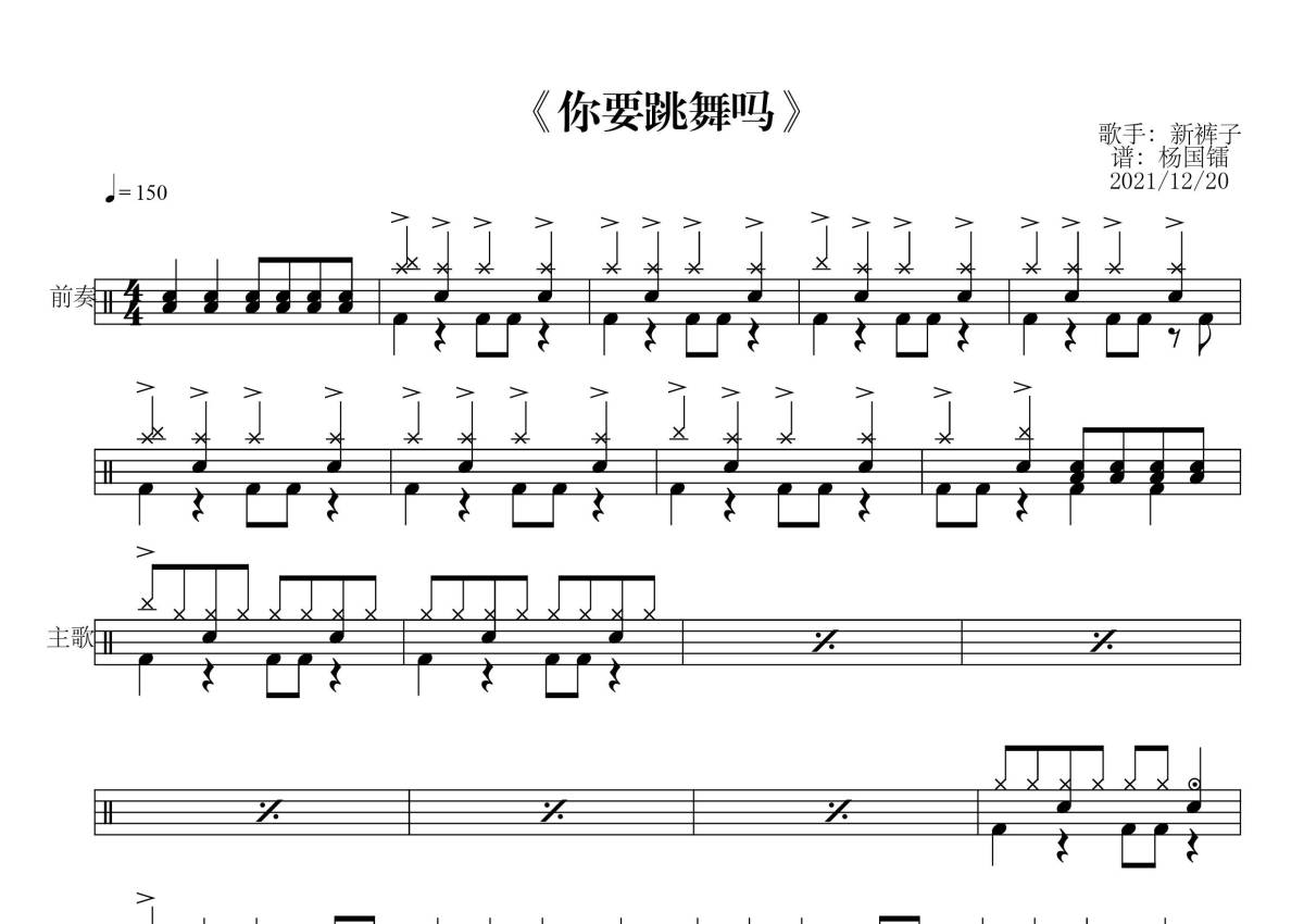 《你要跳舞吗》是新裤子乐队演唱的一首歌曲,拍号为4/4拍,歌曲速度为每分钟150拍,这份架子鼓谱共有三张高清图谱,图谱由 @抓猫儿「镭」 编配上传,图谱使用五线谱编配,使用这份你要跳舞吗架子鼓谱,你将能够轻松地敲打出这首新裤子乐队的你要跳舞吗,快来尝试吧。