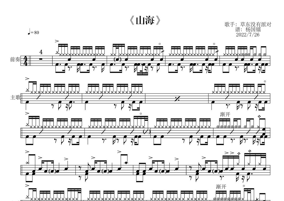 《山海》是草东没有派对演唱的一首歌曲,这份架子鼓谱共有两张高清图谱,图谱由 @抓猫儿「镭」 编配上传,图谱使用五线谱编配,使用这份山海架子鼓谱,你将能够轻松地敲打出这首草东没有派对的山海,快来尝试吧。