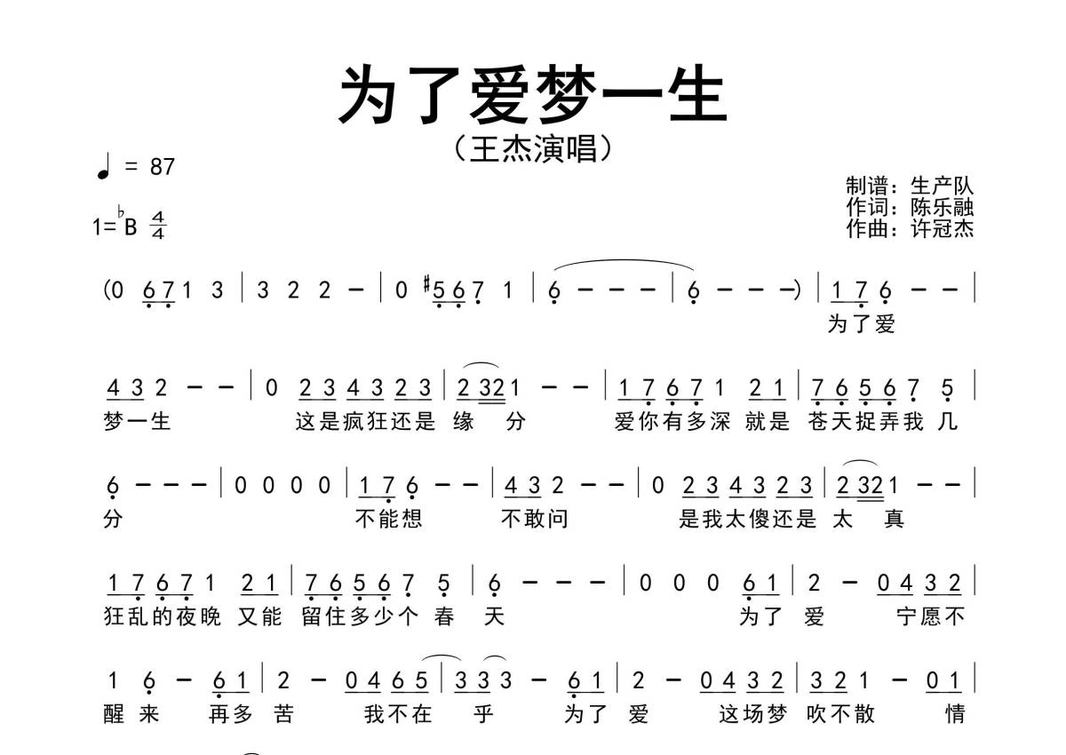 《为了爱梦一生》是王杰演唱的一首歌曲,原版简谱,拍号为4/4拍,歌曲速度为每分钟87拍,这份简谱共有一张高清图谱,图谱由 @生产队 编配上传王杰演唱的经典歌曲《为了爱梦一生》原版简谱。