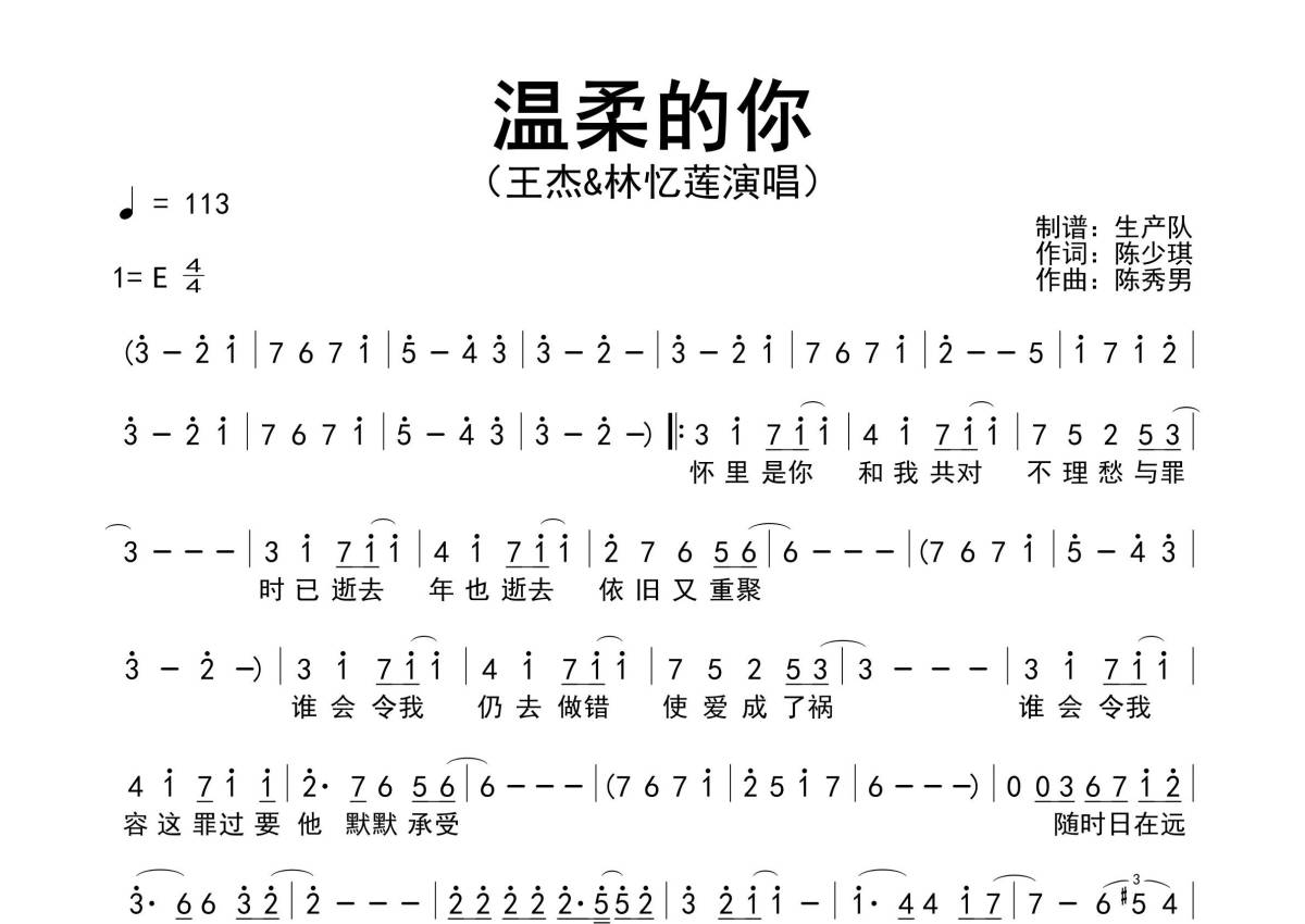 《温柔的你》是王杰/林忆莲演唱的一首歌曲,拍号为4/4拍,歌曲速度为每分钟113拍,这份简谱共有一张高清图谱,图谱由 @生产队 编配上传王杰/林忆莲演唱的经典歌曲《温柔的你》原版简谱。