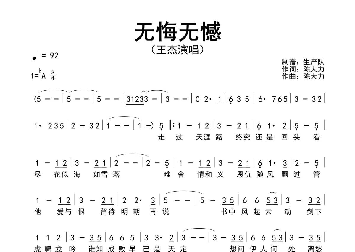 《无悔无憾》是王杰演唱的一首歌曲,原版简谱,拍号为3/4拍,歌曲速度为每分钟92拍,这份简谱共有一张高清图谱,图谱由 @生产队 编配上传王杰唱的经典歌曲《无悔无憾》原版简谱。