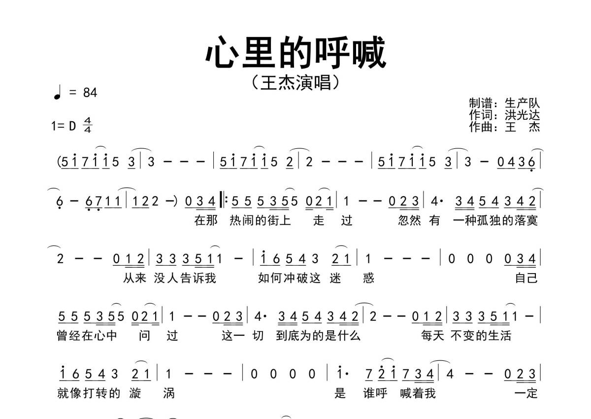 《心里的呼喊》是王杰演唱的一首歌曲,原版简谱,拍号为4/4拍,歌曲速度为每分钟84拍,这份简谱共有一张高清图谱,图谱由 @生产队 编配上传王杰唱的经典歌曲《心里的呼喊》原版简谱。