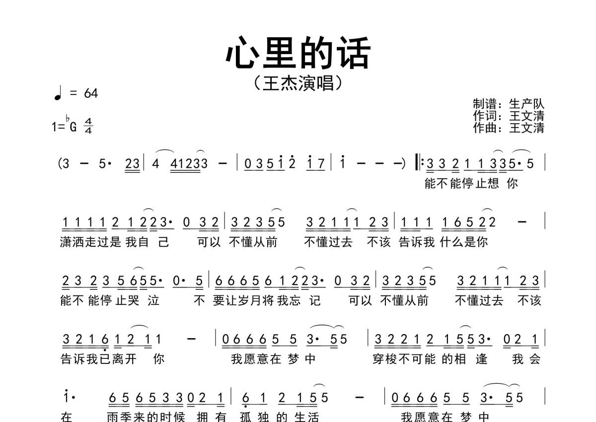 《心里的话》是王杰演唱的一首歌曲,原版简谱,拍号为4/4拍,歌曲速度为每分钟64拍,这份简谱共有一张高清图谱,图谱由 @生产队 编配上传王杰唱的经典歌曲《心里的话》原版简谱。